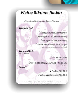 ObgroßerChoroderkleinesVocal-Ensembleeineausgewogene Gesangstechnikhilftjedemund erhöht den Spaß beim Singen.VielenChörenhatdieSopranistin bereitsaufhumorvolleArtWegefür leichteresSingenundmehr Stimmbrillanz gezeigt.Informationengerneübereinenpersönlichen Kontakt.InunregelmäßigenAbständenfindetauchein Work-Shopstatt,dernächste Termin:10.-11.01.2026BeiInteresseanEinzelstunden gibt es Infos hier: www.musikunterrichtpfeiffer.de