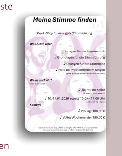ObgroßerChoroderkleinesVocal-EnsembleeineausgewogeneGesangstechnikhilft jedem und erhöht den Spaß beim Singen.VielenChörenhatdieSopranistinbereitsaufhumorvolleArtWegefürleichteresSingen und mehr Stimmbrillanz gezeigt.Informationen gerne über einen persönlichen Kontakt.In unregelmäßigen Abständen findet auch ein Work-Shop statt, der nächste Termin:10.-11.01.2026Bei Interesse an Einzelstunden gibt es Infos hier: www.musikunterrichtpfeiffer.de